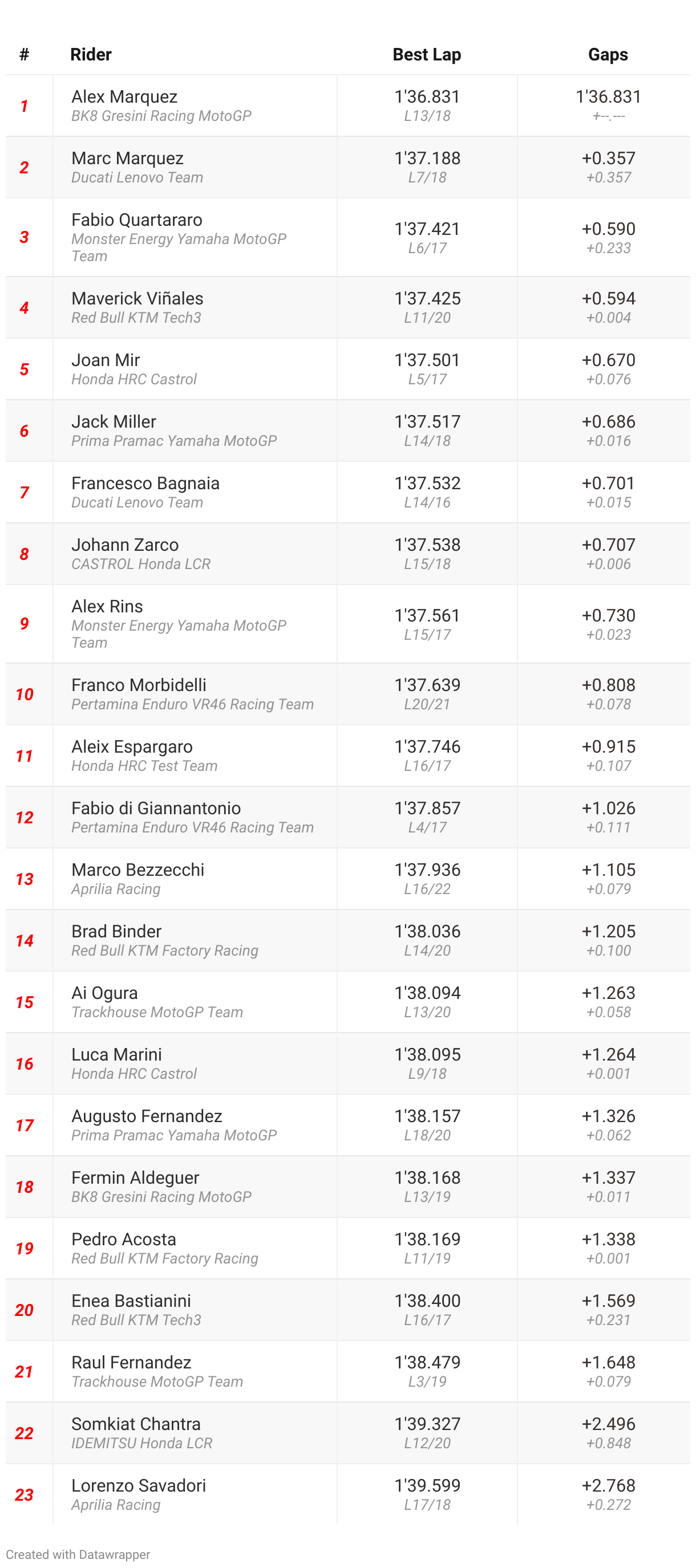 All eyes now turn to the afternoon Practice session at 15:00 local time, where riders will begin pushing for Q2 spots — and the Marquez brothers will look to keep their stranglehold on the top of the timesheets.