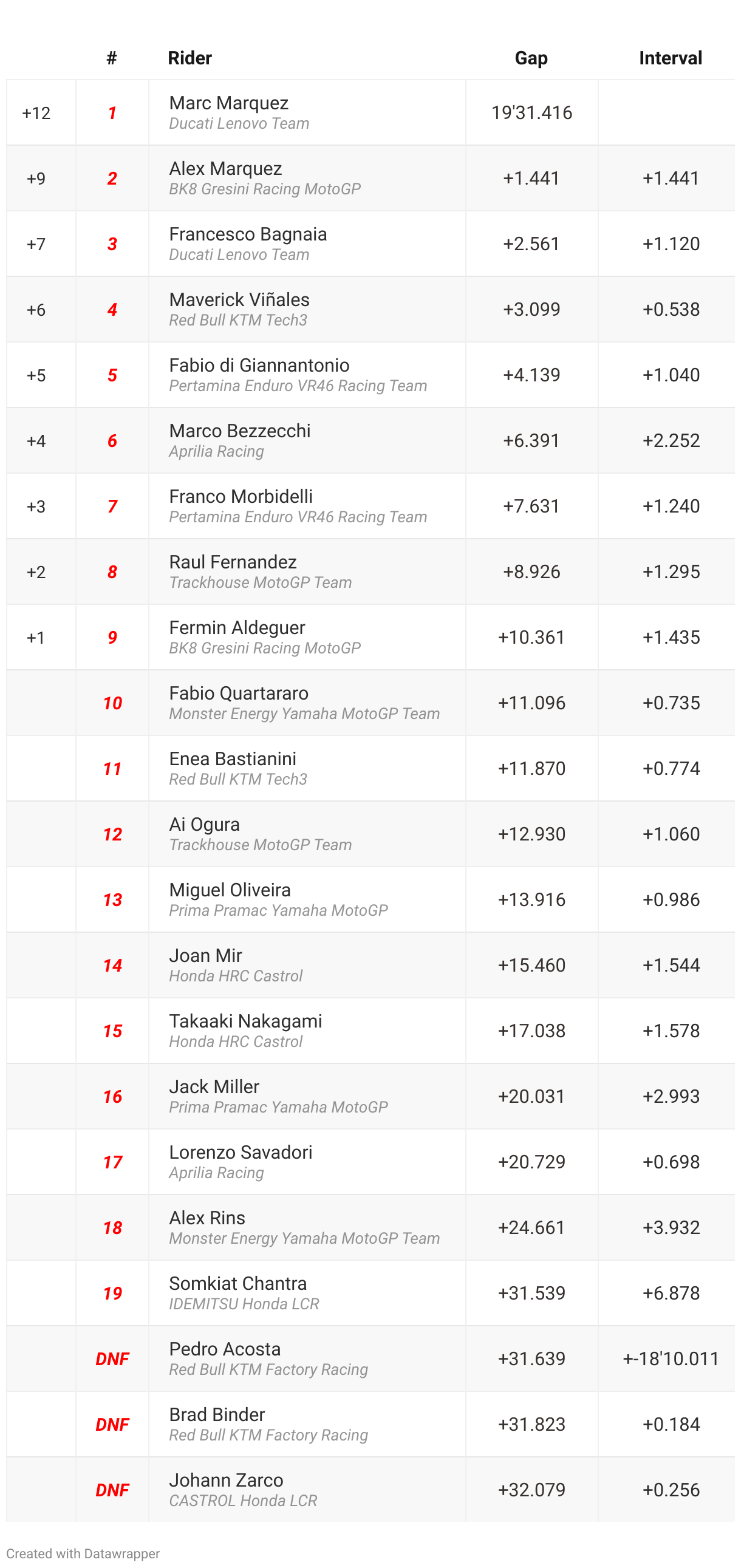 Further back, it was a brutal day for Yamaha. Having started fourth on the grid, Fabio Quartararo looked set for a top five finish early on, but faded as the sprint went on even dropping out of the points altogether when Fermin Aldeguer passed him on the final tour, leaving the Frenchman to finish 10th.