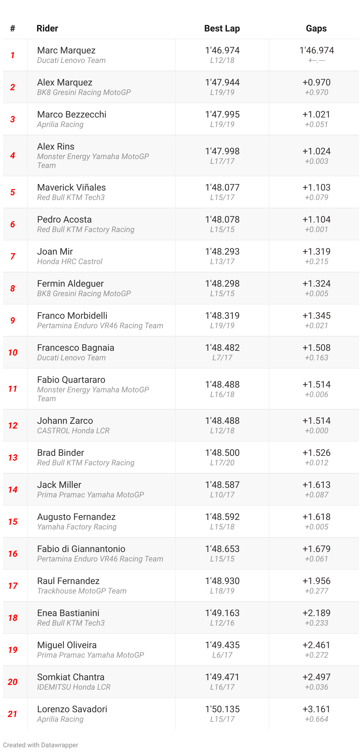 Alex Marquez made it a Marquez 1-2 by pipping Marco Bezzecchi late on. The Gresini Ducati rider left it until his final lap of 19 to post his 1:47.944. Bezzecchi, on the factory Aprilia, slotted into third, just +0.051s further back.