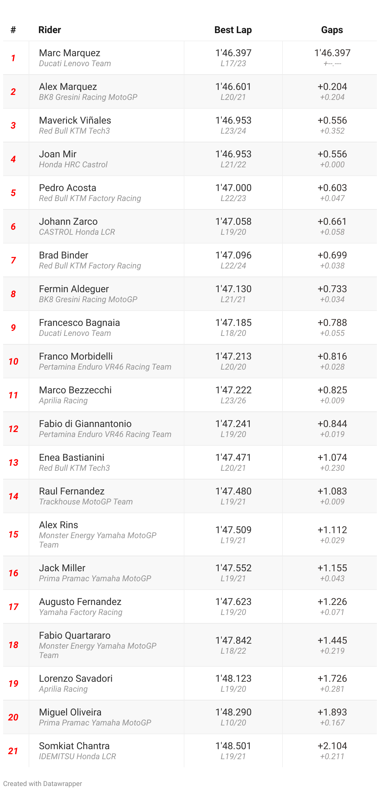 The Spaniard topped his brother Alex ahead of Maverick Vinales and last-1:46-setter Joan Mir.