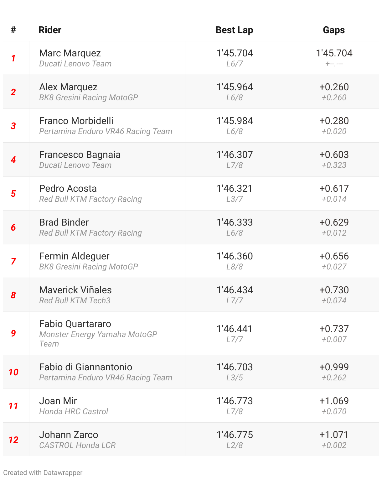 It had been a session that started fast, with both Marquez brothers heading out first. Marc laid down the early benchmark, becoming the first rider to drop into the 1:45s all weekend with his opening flyer.